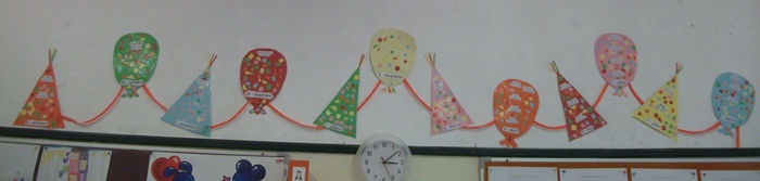 Este é o "Quadro dos nossos aniversários", estamos lá todos e para além de nos fazer perceber em que mês estamos, foi uma aposta nossa. Nós democraticamente escolhemos como o íamos fazer e que materiais íamos utilizar.